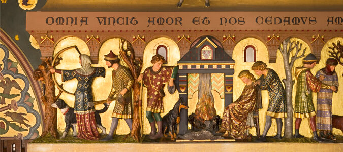Mae’r ystafell hon yn dathlu mynd ar drywydd cyfoeth mwynol o’r ddaear, pwnc priodol o ystyried bod ffortiwn helaeth yr Arglwydd Bute yn deillio o feysydd glo de Cymru. Cynrychiolir gwahanol fathau o gemau gan baentiadau ar y waliau ac yn y ffenestri lliw. Dywedir bod y bathtub marmor wedi’i drawsnewid o sarcophagus Rhufeinig, a brynwyd yn yr Eidal.