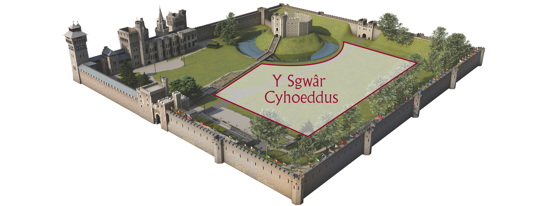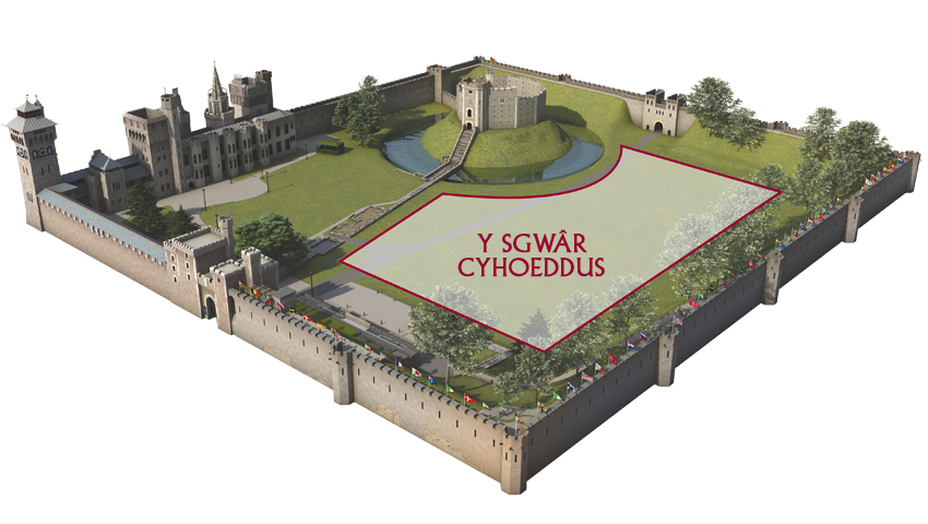 Sylwch: Oherwydd yr amser ailhadu ac adfer sydd ei angen ar lawnt y Castell, bydd y gofod sydd ar gael yn y Sgwâr Cyhoeddus yn llawer llai hyd nes y clywir yn wahanol.