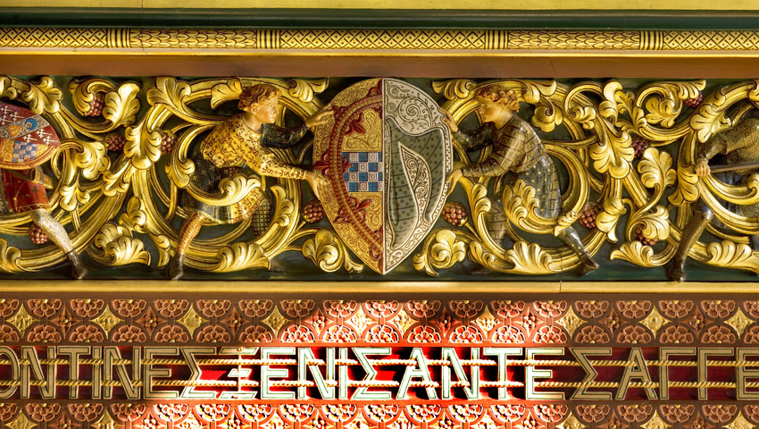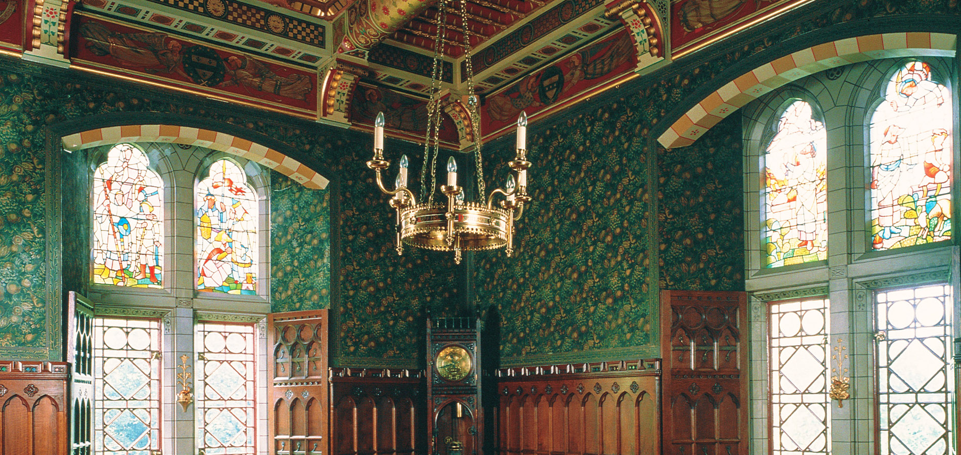 Bwriadwyd i’r waliau gael eu paentio’n wreiddiol, ond nid oeddent wedi’u gorffen pan fu farw William Burges yn 1881. Rhoddwyd y gorchudd wal hessian addurnedig yn ei le yn 1890, a gweithredodd fel cefndir i bortreadau teuluol.