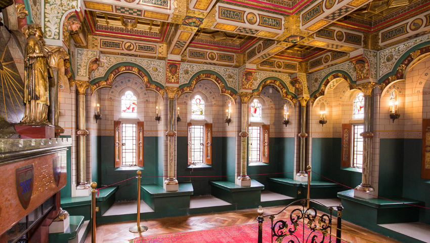 Mae’r ystafell hon yn Nhŵr Bute, a adeiladwyd yn y ddeunawfed ganrif, ond a estynnwyd gan 3ydd Ardalydd Bute ganrif yn ddiweddarach.