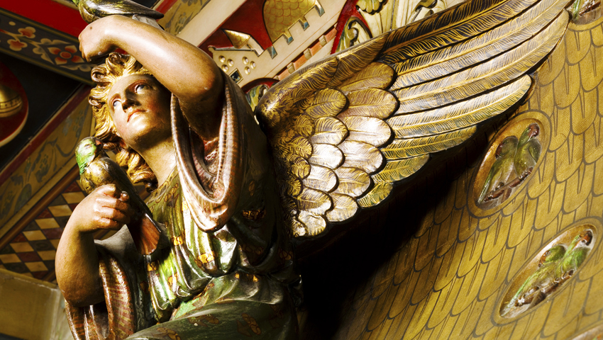 Cafodd wal y simnai ei cherfio gan y cerflunydd Thomas Nicholls, ac mae’n dangos ffigwr adeiniog Cariad, gydag adar cariad ar ei arddyrnau. Mae’r cyfreslun oddi tanodd wedi’i gerfio â chyplau’n caru yn ystod yr haf.